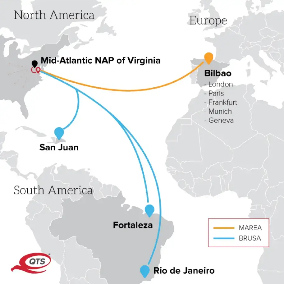 The cables connect from international destinations such as Sopelana in the north of Spain and Rio de Janeiro and Fortaleza in Brazil. The cables terminate in the U.S. in the Virginia Beach Cable Landing Station located in Telxius’ Virginia Beach distribution hub. Telxius is responsible for the operation of the MAREA and BRUSA cables and leverages its IP, capacity, colocation and security services through them, extending the high availability backhaul capacity via its presence in QTS’ Richmond mega data center.